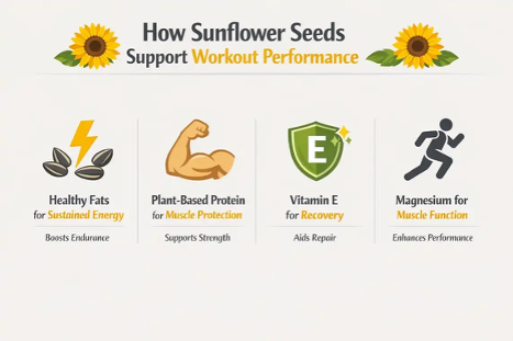 Before going through all the details about sunflower seeds before workout, we should know that eating suitable snack before exercise helps your body perform better. Eating the right food can improve endurance, support muscles, and prevent early fatigue while you are practicing. Your body mainly uses these nutrients for energy during workouts: