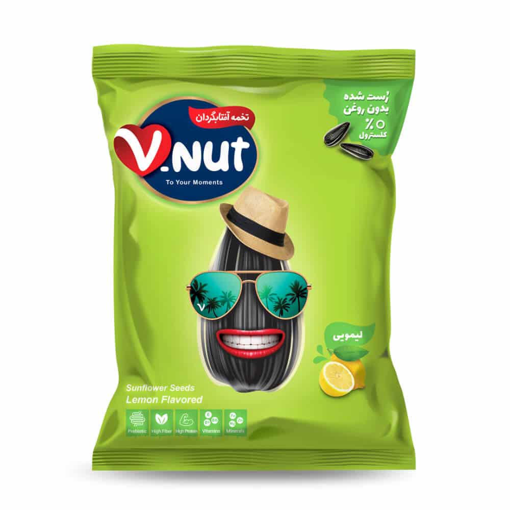Kourosh Foods proudly presents lemon flavored sunflower seeds under V. Nut brand. Each package contains 105 grams of quality roasted sunflower seeds, expertly prepared without the use of oil. These appetizing seeds are not only cholesterol-free but also free from granules and preservatives, ensuring a wholesome snacking experience.